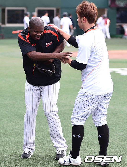 3일 오후 서울 목동구장에서 열린 2014 한국야쿠르트 세븐 프로야구 넥센 히어로즈와 롯데 자이언츠의 경기에 앞서 롯데 강민호가 유먼과 장난을 치고 있다.