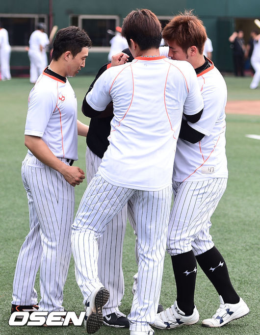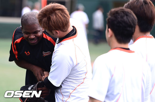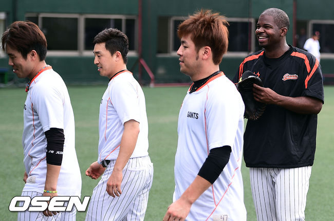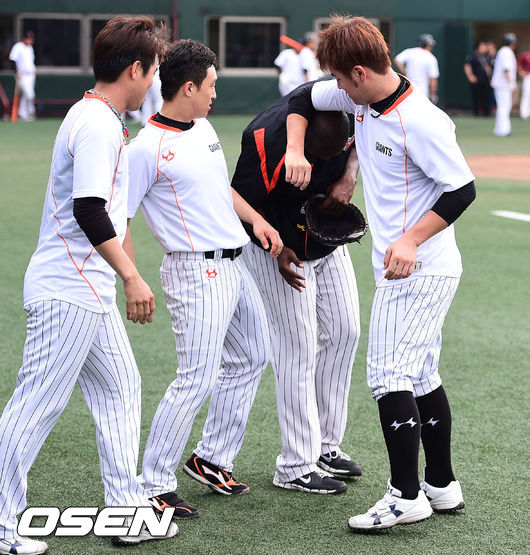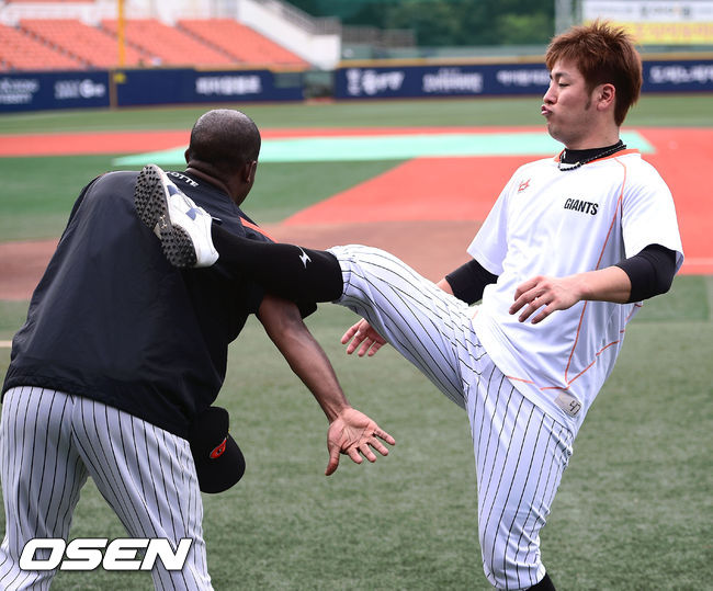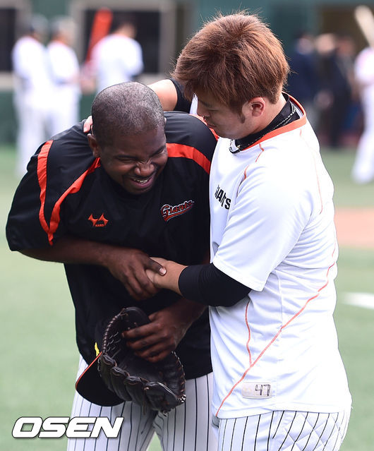3일 오후 서울 목동구장에서 열린 2014 한국야쿠르트 세븐 프로야구 넥센 히어로즈와 롯데 자이언츠의 경기에 앞서 롯데 유먼이 동생들의 괴롭힘에도 미소 짓고 있다.
