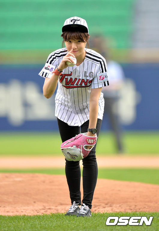 경기에 앞서 개그맨 허민이 시구를 하고 있다.
