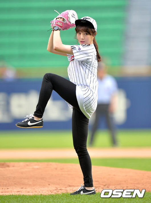 경기에 앞서 개그맨 허민이 시구를 하고 있다.