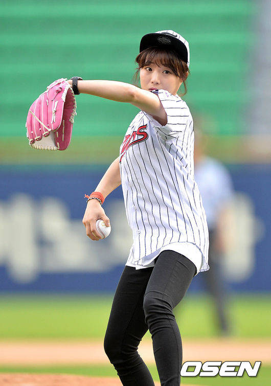 경기에 앞서 개그맨 허민이 시구를 하고 있다.