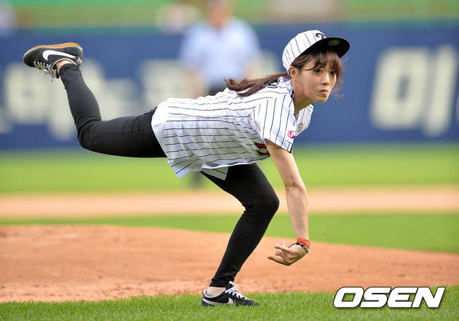 경기에 앞서 개그맨 허민이 시구를 하고 있다.