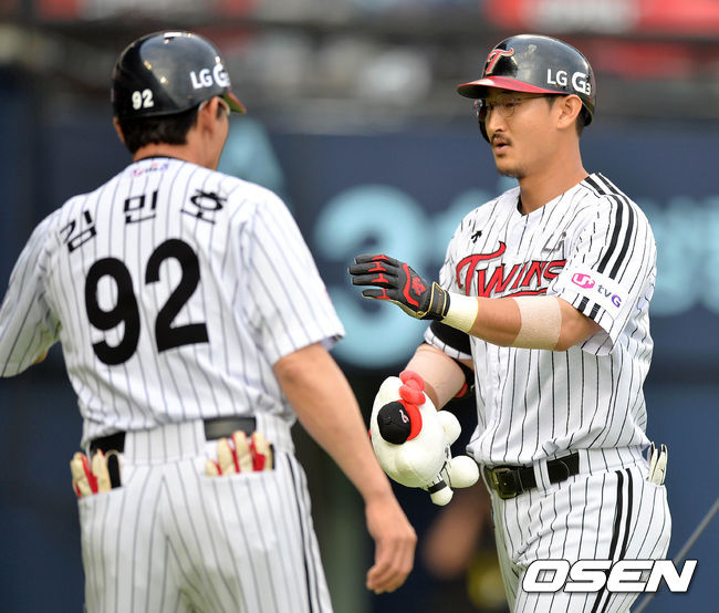 1회말 2사에서 LG 박용택이 좌월 솔로 홈런을 치고 홈에서 김민호 코치와 하이파이브를 하고 있다.