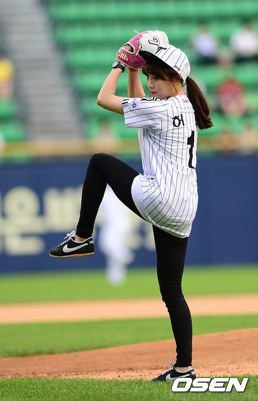 경기에 앞서 시구를 맡은 미녀 개그맨 허민이 와인드업 자세를 취하고 있다.