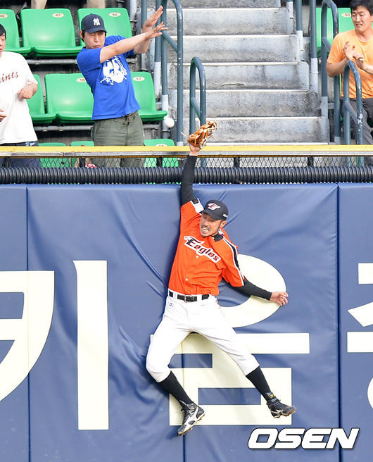 1회말 2사에서 한화 김경언이 LG 박용택의 홈런 타구를 잡으려 점프를 하고 있다.