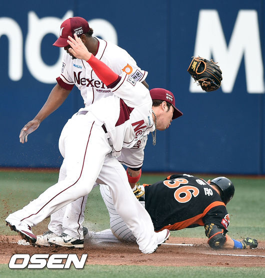 3일 오후 서울 목동구장에서 열린 2014 한국야쿠르트 세븐 프로야구 넥센 히어로즈와 롯데 자이언츠의 경기, 1회초 2사 만루 롯데 박종윤의 내야안타때 넥센 1루수 박병호가 소사와 충돌하며 1타점을 허용하고 있다.