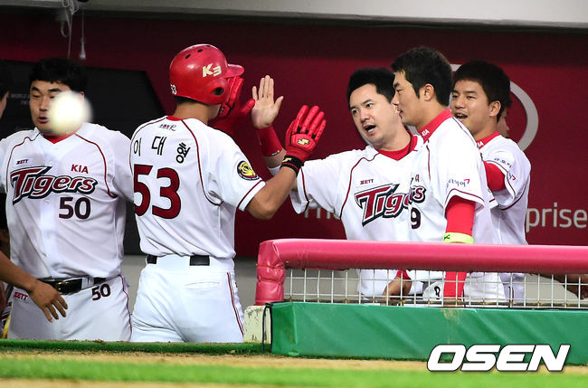 1회말 무사 1,2루에서 KIA 나지완의 1타점 우전 적시타에 2루주자 이대형이 홈을 밟고 더그아웃에서 동료선수들과 하이파이브를 하고 있다.
