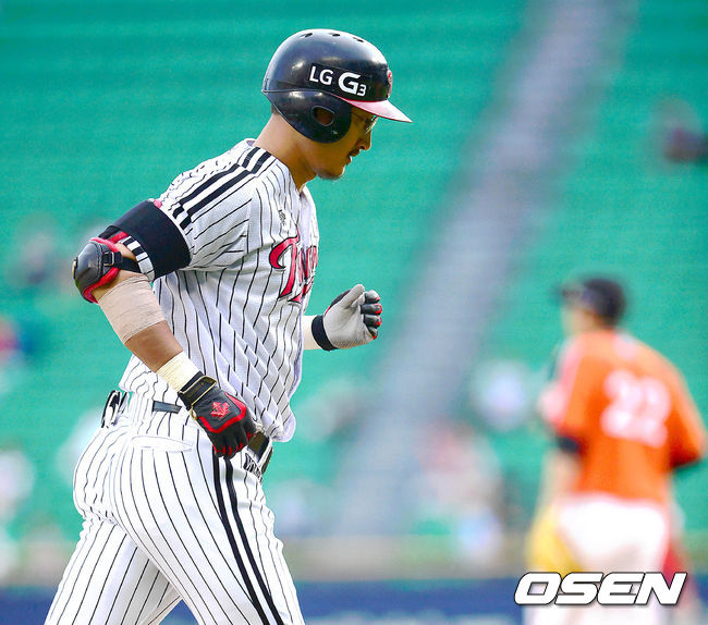 1회말 2사 LG 박용택이 한화 이태양의 1구를 받아 쳐 좌측담장을 넘기는 솔로홈런을 가동하고 홈으로 들어가고 있다.