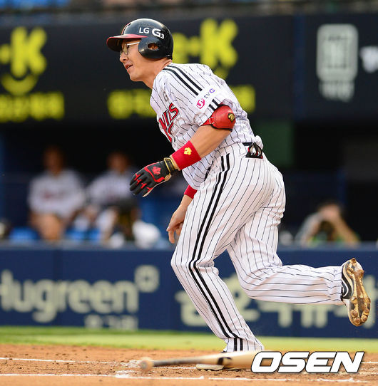 2회말 1사 주자 1,2루 LG 손주인이 1타점 적시타를 치고 있다.