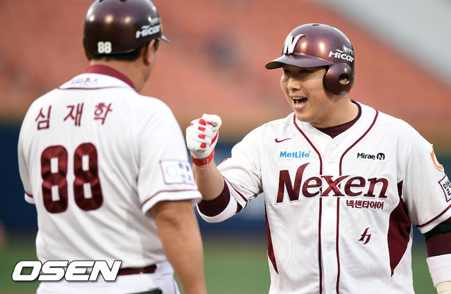 3일 오후 서울 목동구장에서 열린 2014 한국야쿠르트 세븐 프로야구 넥센 히어로즈와 롯데 자이언츠의 경기, 1회말 2사 만루 넥센 허도환이 역전 2타점 적시타를 날리고 환호하고 있다.