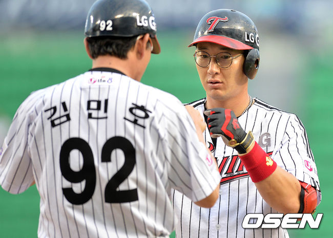 1회말 1사 1,2루에서 LG 손주인이 좌전 적시타를 치고 김민호 코치와 하이파이브를 하고 있다.