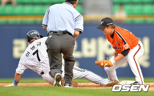 2회말 무사 1,2루에서 LG 이병규가 한화 포수 정범모의 견제때 급히 귀루하고 있다.