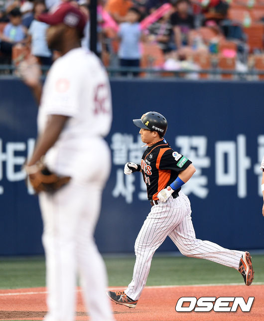3일 오후 서울 목동구장에서 열린 2014 한국야쿠르트 세븐 프로야구 넥센 히어로즈와 롯데 자이언츠의 경기, 2회초 무사 1,2루 롯데 손아섭이 역전 3점 홈런을 날리고 베이스를 돌고 있다.