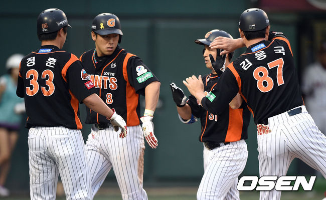 3일 오후 서울 목동구장에서 열린 2014 한국야쿠르트 세븐 프로야구 넥센 히어로즈와 롯데 자이언츠의 경기, 2회초 무사 1,2루 롯데 손아섭이 역전 3점 홈런을 날리고 동료들의 축하를 받고 있다