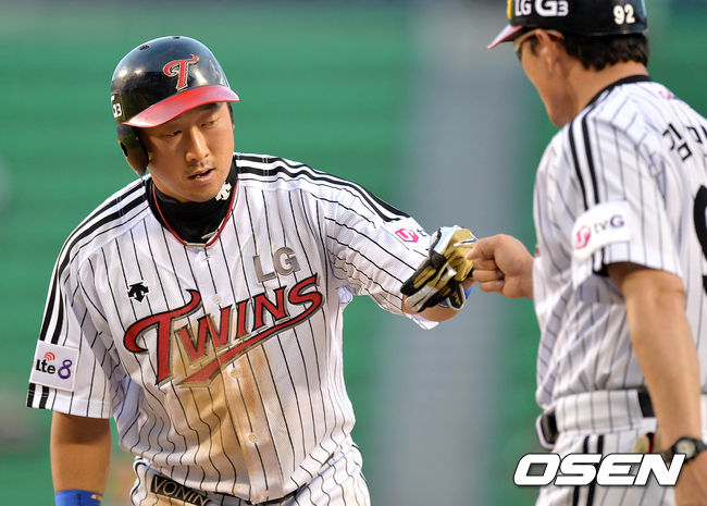 3회말 2사 3루에서 LG 이병규가 우전 적시타를 치고 김민호 코치와 하이파이브를 하고 있다.