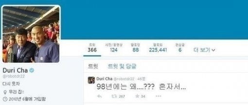 대한축구협회 허정무 부회장은 3일 홍명보 감독의 유임을 공식 발표했다. 홍명보 감독 유임 발표 후 2시간 뒤 FC서울 차두리는 자신의 트위터에 "98년에는 왜? 혼자서..."라는 의미심장한 글을 올렸다. 차두리 트위터 글은 1998년 프랑스 월드컵 당시 상황과 비교해 불만을 나태는 것으로 해석된다.