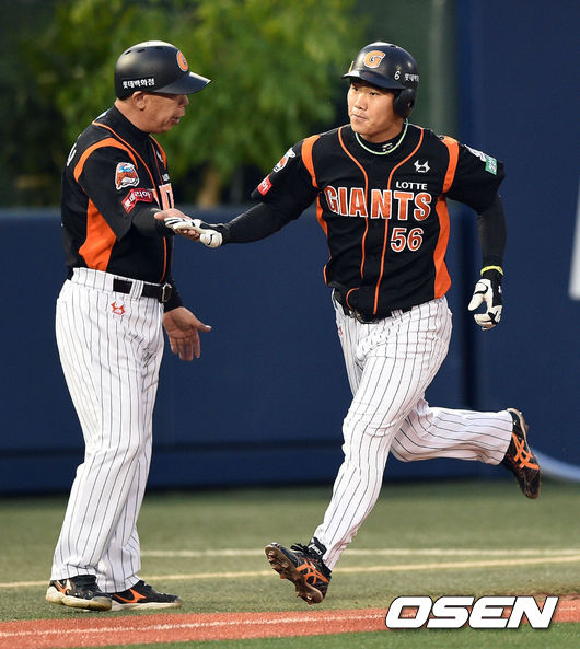 3일 오후 서울 목동구장에서 열린 2014 한국야쿠르트 세븐 프로야구 넥센 히어로즈와 롯데 자이언츠의 경기, 3회초 2사 롯데 신본기가 솔로홈런을 날린후 모토니시 코치와 하이파이브를 하고 있다