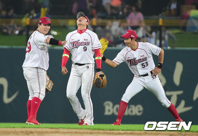 4회초 1사 2루에서 KIA 김민우가 두산 이원석의 타구를 유격수 플라이로 처리하며 나지완, 이대형의 격려를 받고 있다.