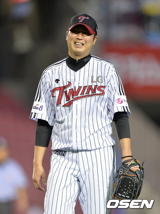 5회초 2사에서 LG 우규민이 한화 정근우를 외야플라이로 처리하고 미소짓고 있다.