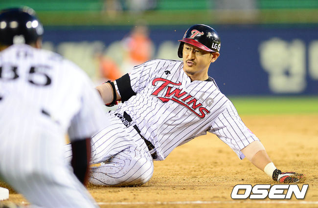 5회말 무사 LG 박용택이 우중간을 가르는 2루타를 치고 3루로 슬라이딩하고 있다.