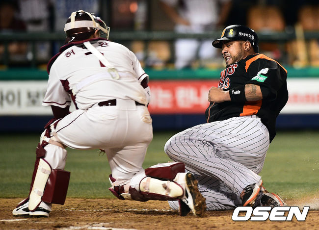 3일 오후 서울 목동구장에서 열린 2014 한국야쿠르트 세븐 프로야구 넥센 히어로즈와 롯데 자이언츠의 경기, 5회초 무사 1루 롯섿 박종윤의 2루타때 1루 주자 히메네스가 홈에서 태그아웃되고 있다.