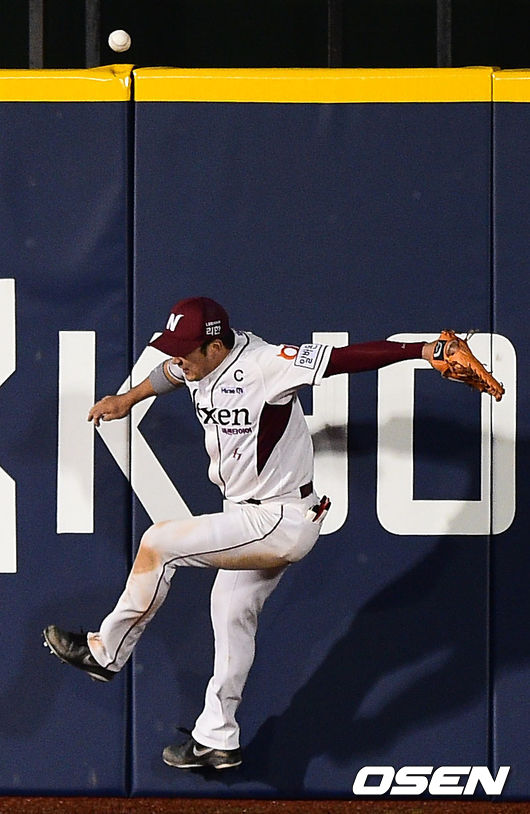 3일 오후 서울 목동구장에서 열린 2014 한국야쿠르트 세븐 프로야구 넥센 히어로즈와 롯데 자이언츠의 경기, 5회초 무사 1루 롯데 박종윤이 날린 타구가 홈런라인에 맞고 튕겨져 나오고 있다. 비디오 판독 결과 인정 2루타.