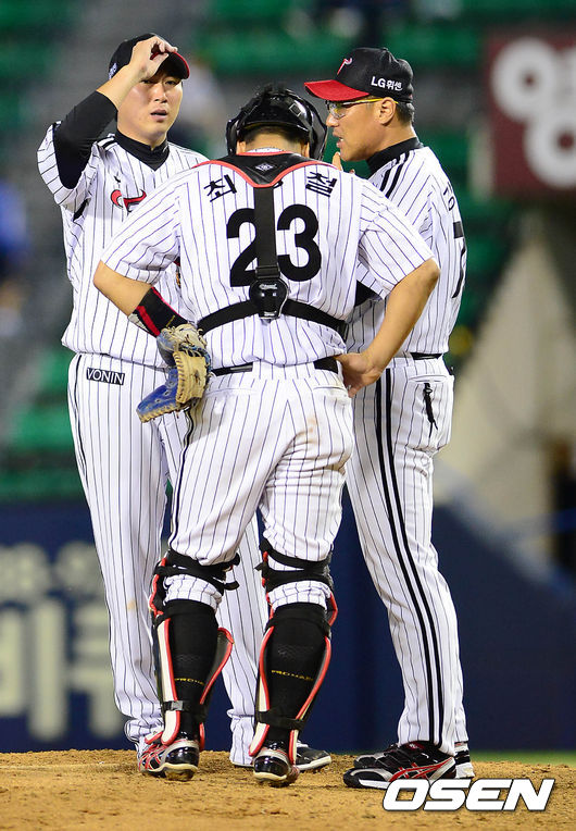 6회초 1사 주자 1루 LG 우규민이 한화 김태균을 땅볼로 돌려세운 마운드를 방문한 강상수 코치와 이야기를 나누고 있다.
