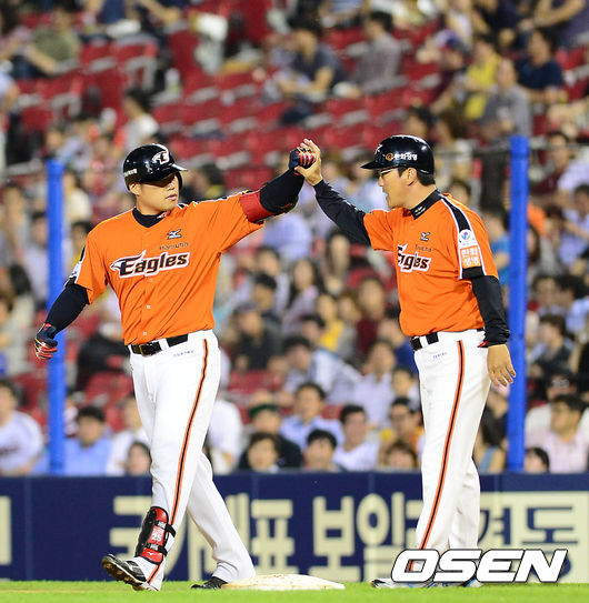 한화 최진행이 6회초 2사 주자 2루 한화 정현석의 대타로 나와 1타점 적시타를 치고 기뻐하고 있다.