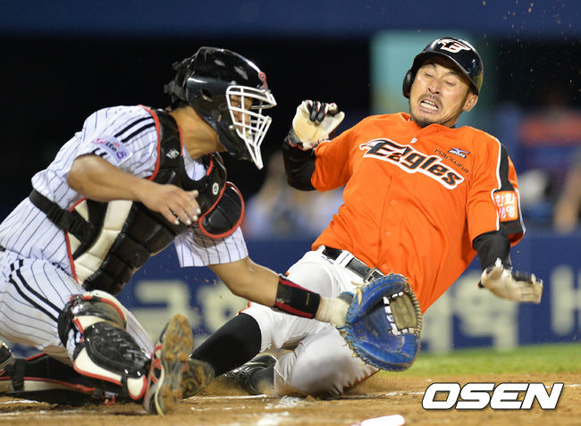 6회초 2사 2루에서 한화 고동진의 우전 적시타때 2루주자 김경언이 홈으로 쇄도해 세이프 되고 있다.