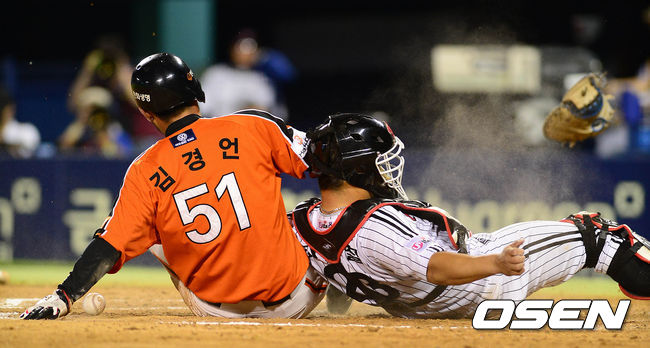 6회초 2사 주자 2루 한화 고동진의 안타에 2루주자 김경언이 홈으로 쇄도해 세이프 되고 있다.