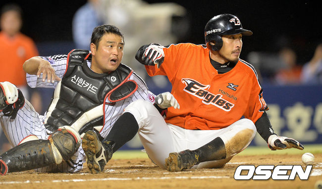 6회초 2사 2루에서 한화 고동진의 우전 적시타때 2루주자 김경언이 홈으로 쇄도하며 LG 포수 최경철과 함께 심판의 판정을 바라보고 있다.