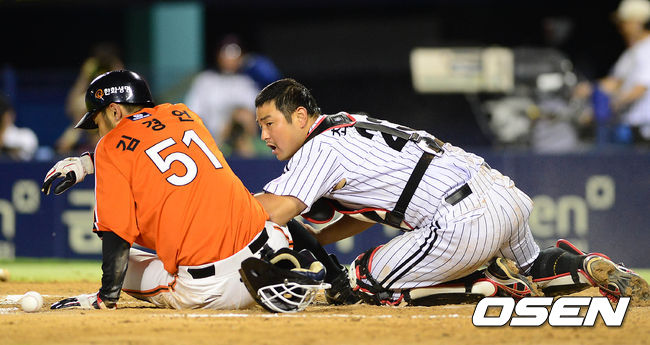 6회초 2사 주자 2루 LG 최경철이 쇄도하는 한화 김경언과 충돌 후 공을 찾고 있다.