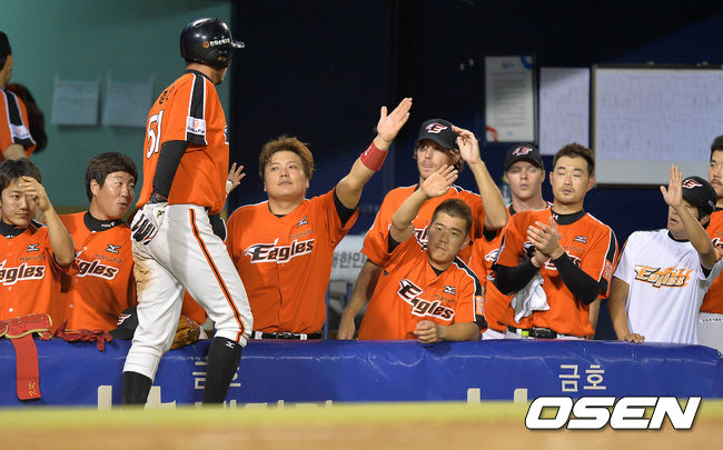 6회초 2사 2루에서 한화 고동진의 우전 적시타때 홈을 밟은 2루주자 김경언이 더그아웃에서 동료들과 환호하고 있다.