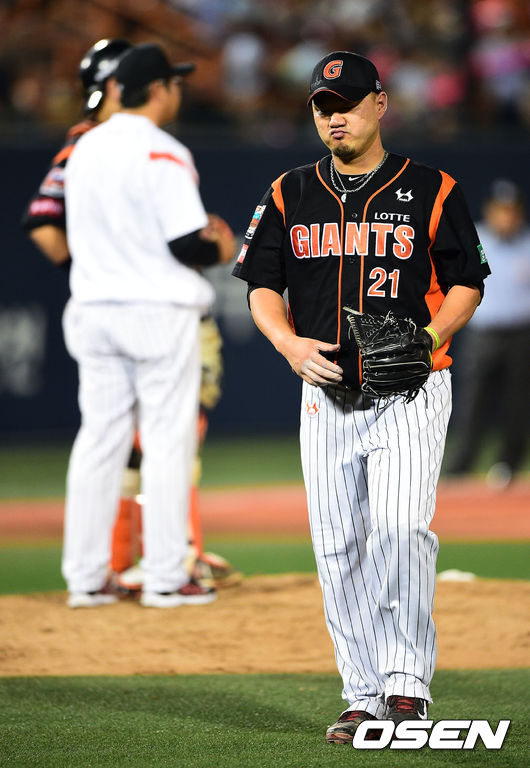 3일 오후 서울 목동구장에서 열린 2014 한국야쿠르트 세븐 프로야구 넥센 히어로즈와 롯데 자이언츠의 경기, 5회말 롯세 선발투수 송승준이 강판되고 있다. 현재 송승준은 4⅓이닝 9실점 패전위기.