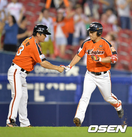 7회초 1사 1루에서 한화 정근우가 좌중월 투런 홈런을 치고 이종범 코치와 하이파이브를 하고 있다.