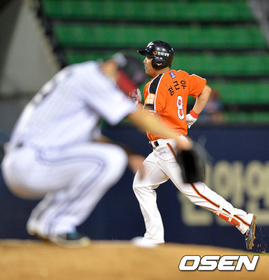 7회초 1사 1루에서 한화 정근우가 좌중월 투런 홈런을 치고 그라운드를 돌고 있다.