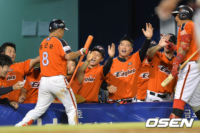 7회초 1사 1루에서 한화 정근우가 좌중월 투런 홈런을 치고 더그아웃에서 동료들과 환호하고 있다.