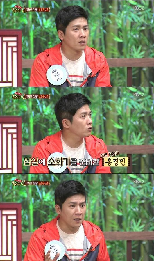 홍경민은 3일 오후 8시 55분 방송된 KBS 2TV '밥상의 신'에서 등산 가방을 공개하던 중 "나는 안전 주의자다. 침대 옆에 소화기도 있다"고 설명했다.
