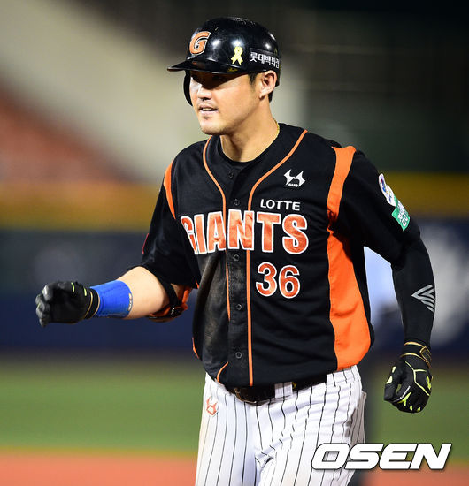 3일 오후 서울 목동구장에서 열린 2014 한국야쿠르트 세븐 프로야구 넥센 히어로즈와 롯데 자이언츠의 경기, 7회초 1사 1,2루 롯데 박종윤이 동점 1타점 적시타를 날리고 환호하고 있다.