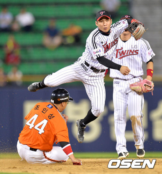 8회초 1사 1,2루에서 LG 오지환이 한화 이용규를 병살타로 처리하고 있다.