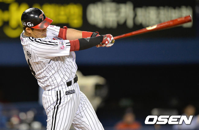 8회말 1사 1,3루에서 LG 정의윤이 중전 적시 2루타를 치고 있다.