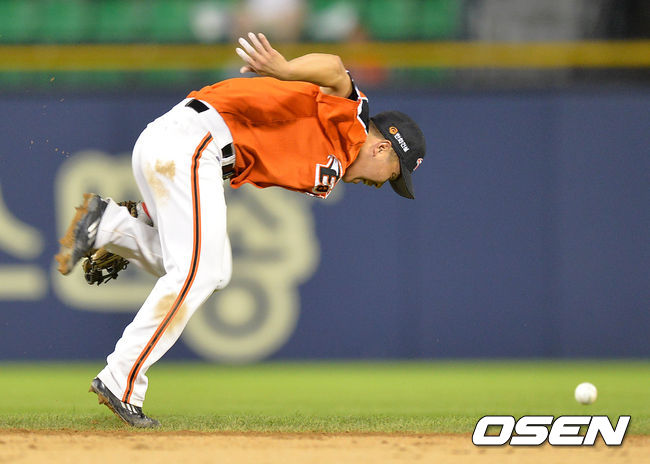 8회말 1사 1,3루에서 한화 정근우가 투수 안영명의 글러브를 맞고 휘어져 나가는 LG 정의윤의 타구를 놓치고 있다.
