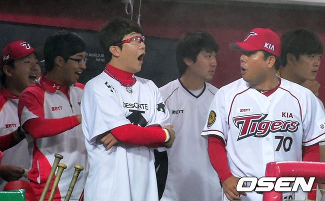 9회초 2사 1루에서 KIA 양현종이 두산 민병헌의 좌전 안타에 박준태가 2루에서 아웃시키자 깜짝 놀라며 기뻐하고 있다./ jpnews@osen.co.kr