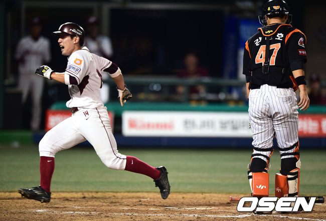 3일 오후 서울 목동구장에서 열린 2014 한국야쿠르트 세븐 프로야구 넥센 히어로즈와 롯데 자이언츠의 경기,8회말 1사 3루 넥센 유한준의 희생타때 3루 주자 서건창이 득점하고 있다. 8회말 현재 점수는 10-9 넥센이 리드.