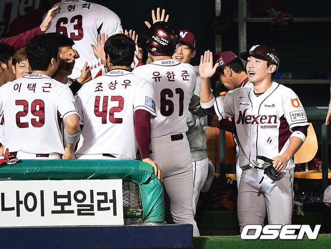 3일 오후 서울 목동구장에서 열린 2014 한국야쿠르트 세븐 프로야구 넥센 히어로즈와 롯데 자이언츠의 경기,8회말 1사 3루 넥센 유한준의 희생타때 3루 주자 서건창이 득점했다. 8회말 현재 점수는 10-9 넥센이 리드. 서건창과 유한준이 동료들의 축하를 받고 있다.