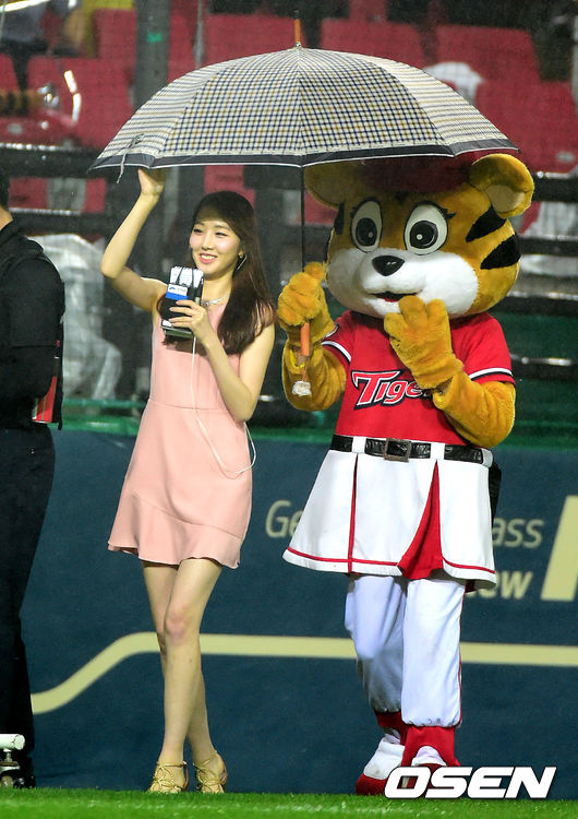경기후 KIA 마스코트가 SBS Sports 김세희 아나운서에 우산을 씌워주며 인터뷰 준비를 돕고 있다./ jpnews@osen.co.kr