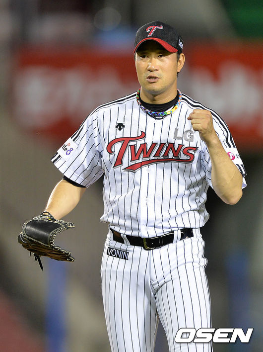 9회초 2사에서 LG 봉중근이 한화 김태균을 내야땅볼로 처리하고 환호하고 있다./sunday@osen.co.kr