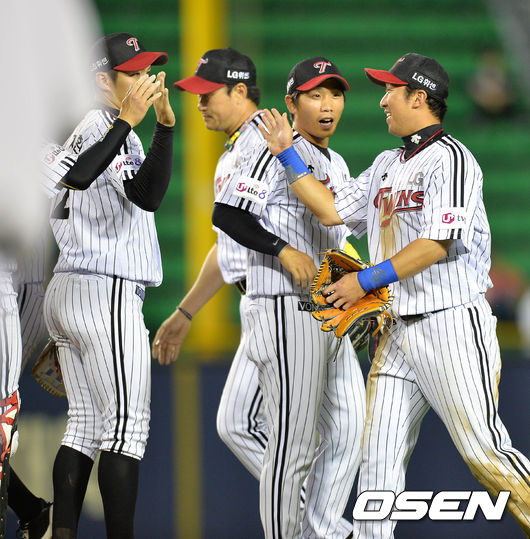 경기 종료 후 LG 선수들이 승리의 기쁨을 나누고 있다./sunday@osen.co.kr