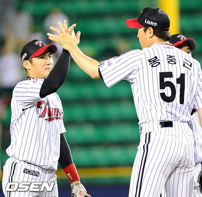 경기종료후 LG 마무리 투수 봉중근과 김태균을 땅볼 아웃 처리한 유격수 오지환이 승리의 기쁨을 나누고 있다./greenfield@osen.co.kr