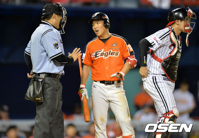 9회초 무사에서 한화 정근우가 문동균 주심에 스트라이크 판정에 대해 어필하고 있다./sunday@osen.co.kr
